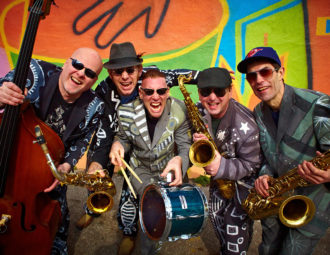 What do you get when you cross 3 amazing saxophonists dressed in wacky clothes, a crazy dancing drummer and a killer upright bass player and have them sing songs about Buses, Roaches and Hockey and spend 1/2 their time playing in the audience? The Shuffle Demons, that’s what!!! They were a band that captured the imagination of a generation with their antics and amazing no holds barred playing and stopped traffic on a regular basis. And now they’re back!!